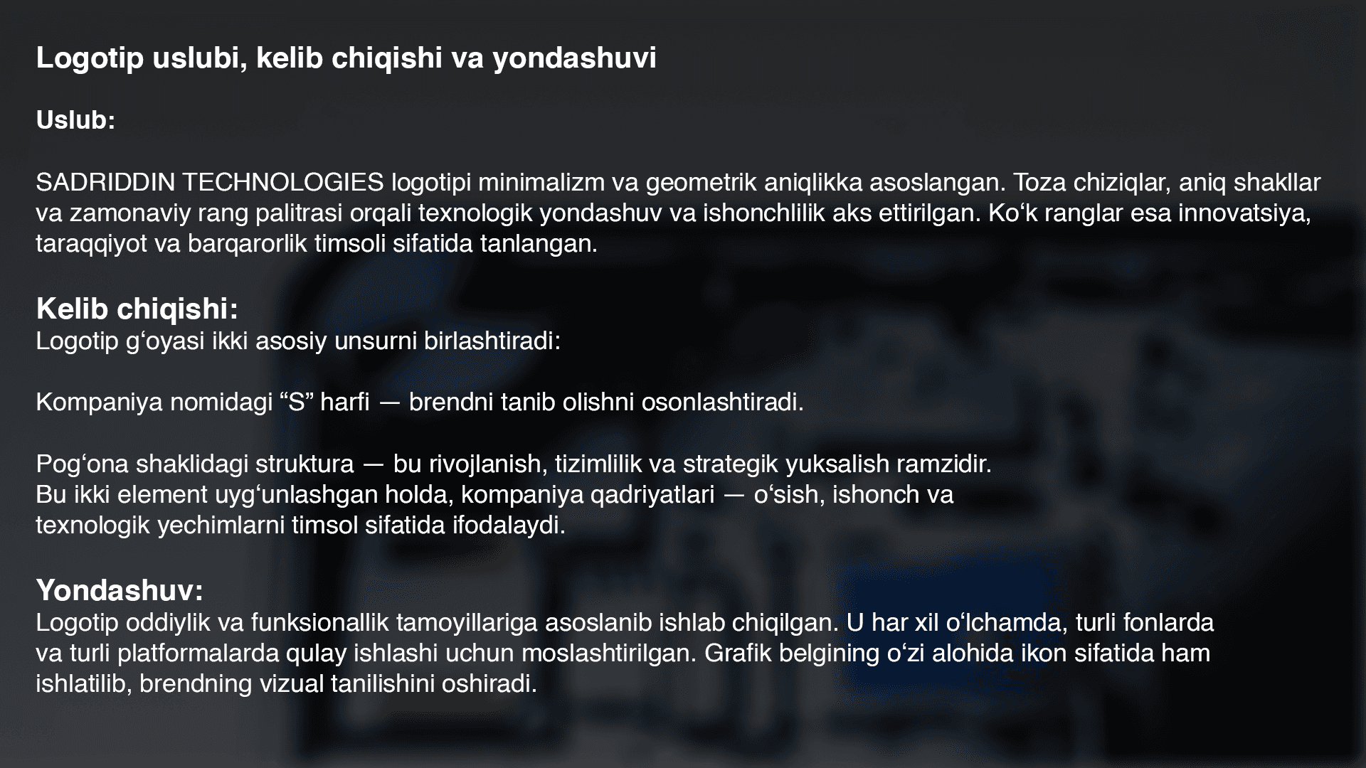 Ushbu boвЂlimda mening ijodiy tajribam va saralangan ishlarim jamlamasi bilan tanishishingiz mumkin. bu yerda ekskluziv logotiplar, toвЂliq brending strategiyalari, ijtimoiy tarmoqlar uchun dinamik smm dizaynlar hamda yuqori sifatli poligrafiya (pechat) uchun tayyorlangan ishlar jamlangan.
